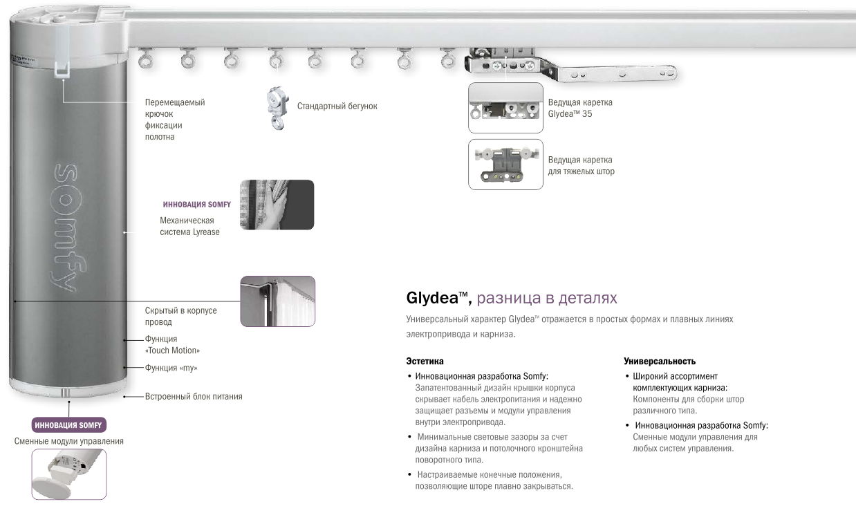 Электрокарнизы Somfy обладают самой широкой линейкой электроприводов. Большое количество приводов позволяет ему занимать 1 место среди всех систем электрокарнизов. Somfy Glydea - это отличное соотношение цена/качество, так как среди европейских систем она является самой недорогой, а качество гарантировано компанией Somfy (гарантия 5 лет).